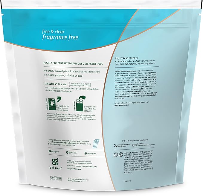 • Contains: 1- 132 Pod Bag of Grab Green Natural Fragrance Free 3in1 Laundry Detergent Pods. Our velcro closure bags are convenient and easy to use, no hassling with frustrating zip closures