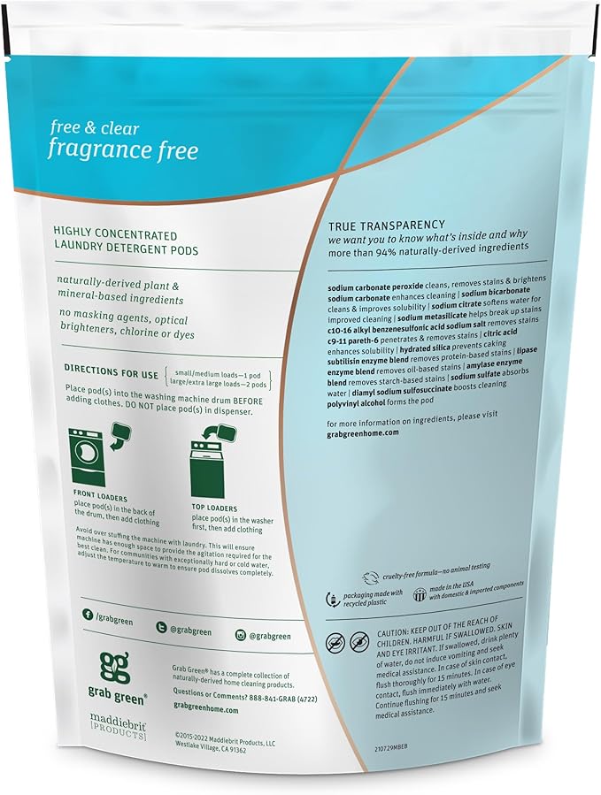 • Contains: 1- 24 Pod Bag of Grab Green Natural Fragrance Free 3in1 Laundry Detergent Pods. Our velcro closure bags are convenient and easy to use, no hassling with frustrating zip closures