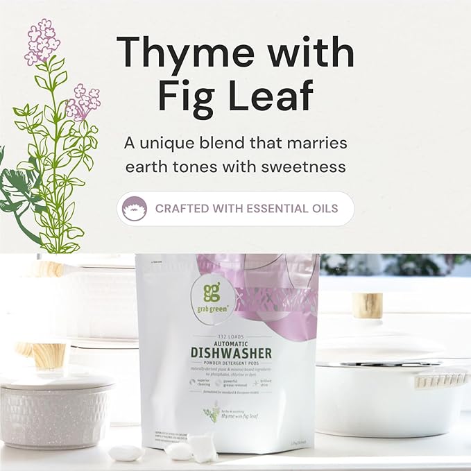 Grab Green Automatic Dishwashing Detergent Pods, 132 Count, Thyme Fig Leaf Scent, Plant and Mineral Based, Superior Cleaning, Powerful Grease Removal,