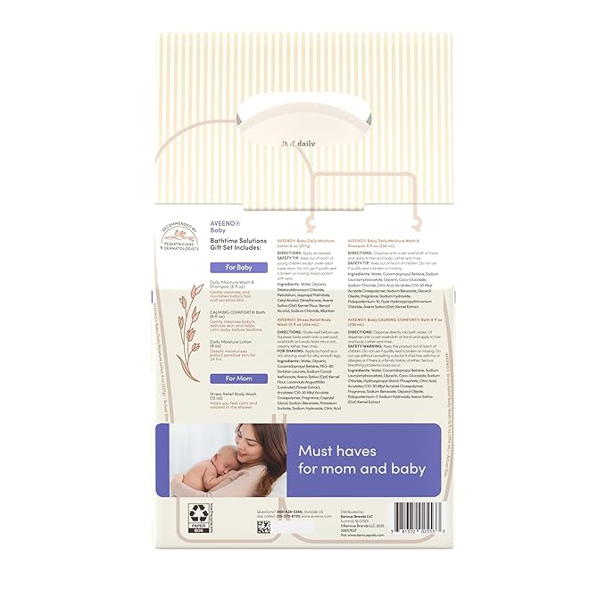 • Includes a 12 fl ounce bottle of Aveeno stress relief body wash for mom that combines natural colloidal oatmeal with scents of lavender, chamomile and ylang-ylang oils for a relaxing soap-free cleanse that is gentle enough to use on sensitive skin