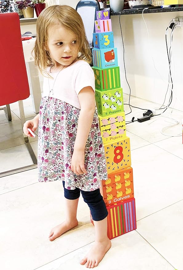 • Solid, strong and multifunctional nesting and sorting cube blocks with bright rainbow colour design printed in wood. It has more educational functions than any other stacking cubes and nesting toys. You can stack the cups up to make a 115 cm tall tower and nest them inside each other at 15.5 centimetres in the colourful box for easy storage.