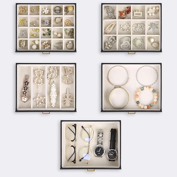 • 5 removable drawers for maximum jewelry storage. The deeper bottom drawer has only one compartment. Its size is 7.31"L x 5.81"W x 2.25"H. The other 4 drawers have the equal size. Their size is 7.31"L x 5.81"W x 1.00"H. Drawer 1 has 20 equal size compartments; Drawer 2 has 12 equal size compartments; Drawer 3 has 4 equal size compartments; Drawer 4 has just one compartment.