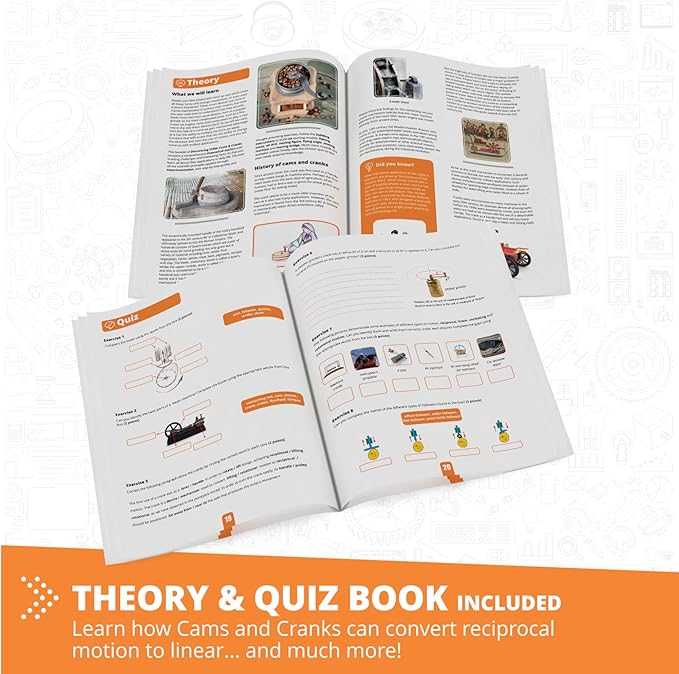 • LEARN ABOUT MOTION: Kids explore power transmission using cams and cranks, converting linear motion into rotation. Build 8 working models, including a fishing crane, oil pump, flying eagle & more.