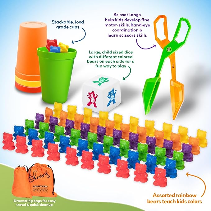 • Fun from A to Z: Our versatile Counting Bears offer countless kindergarten learning activities including sorting, counting, stacking, and matching. Complete with matching sorting cups, bear counters, and a color die, kids can explore various math concepts while enhancing fine motor skills and hand-eye coordination.