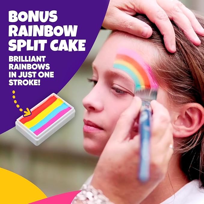 • 🎨 π—–π—’π— π—£π—Ÿπ—˜π—§π—˜ π—™π—”π—–π—˜ π—£π—”π—œπ—‘π—§ π—žπ—œπ—§: Unleash creativity with 28 vibrant color face painting kit for kids, 24 reusable stencils, 100 gem stickers, 2 body glitter pots, 3 brushes, 4 sponges, & a 16-design booklet & bonus rainbow split cake - fun for the whole family! A fun Halloween face paint kit with stencils and Halloween face paint kit for adults. Please note: Packaging may vary