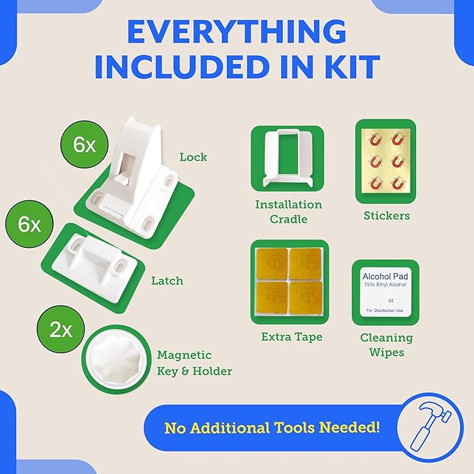 • Complete Child Proofing Kit: Take baby safety to the next level with our comprehensive kit, which includes 6 magnetic cabinet locks, 2 keys, an installation cradle, a measuring ruler, and extra 3M adhesive tape.