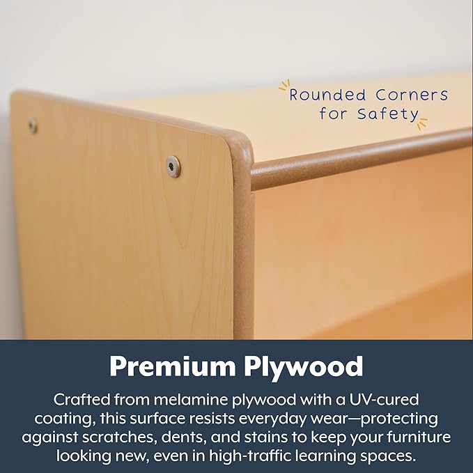 • DURABLE & STURDY CONSTRUCTION: Made from 5/8” thick maple-faced melamine, this bookshelf for kids is built to withstand daily use. Its UV finish resists scratches and stains, ensuring lasting quality in classrooms, playrooms, and daycare spaces.