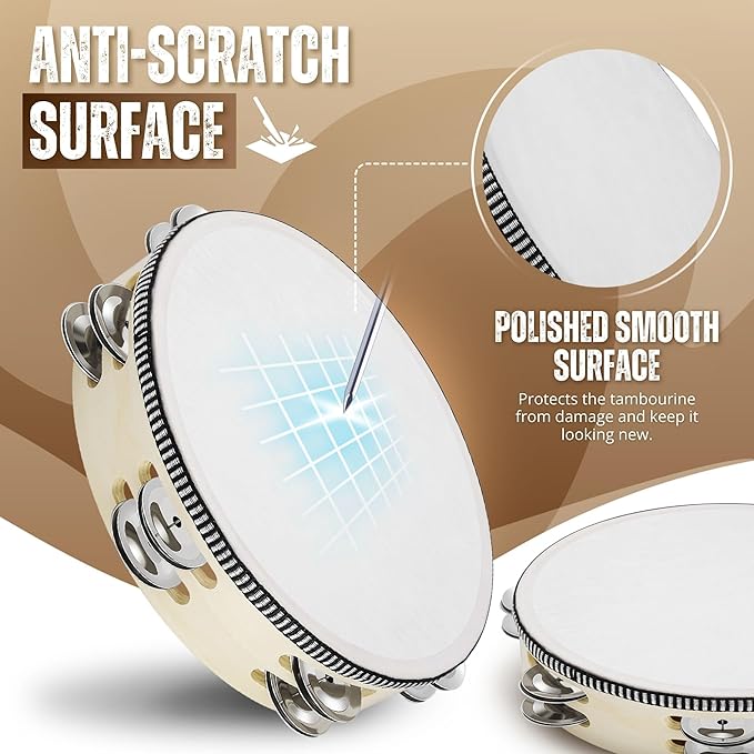 • Elevate your Music: Our tambourines for adults and kids have 8 pairs of single-row metal jingles that produce a crisp, clear sound; the tambourine is one of the musical instruments that adds depth and complexity to your music