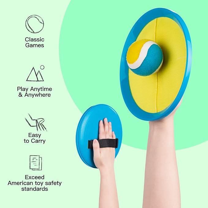 • 【Keep the Kids Active, Learning Basic Motor Skills】The catch and toss game helps kids develop hand-eye coordination and arm muscles, keeping them active and helping to release their extra energy. It is an effective way for kids to learn about baseball and football. EVERICH paddle rackets have been laboratory tested and are safe and non-toxic, so they are safe for kids to play with.