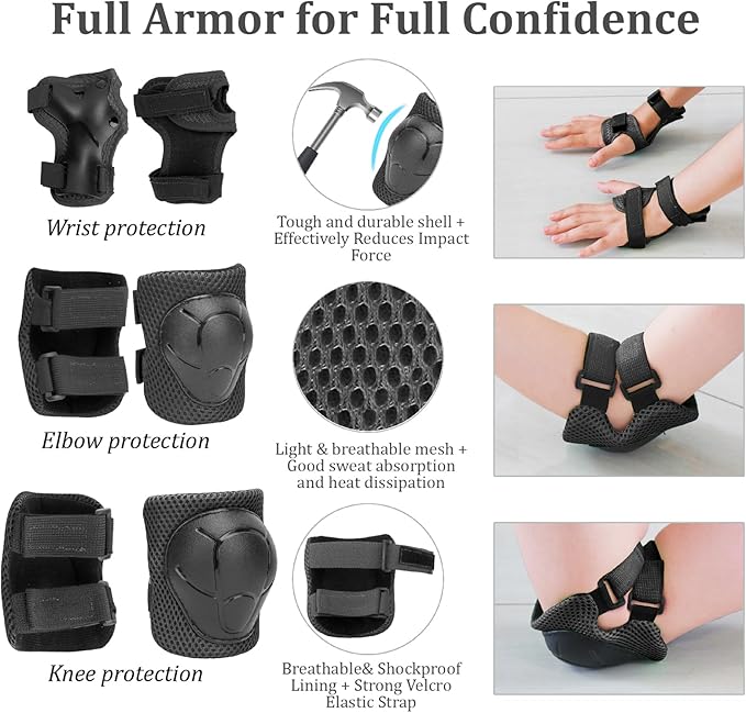 • 【7 pcs Kids Helmet Protective Gear】- Including 1 bike helmet, 2 x Elbow Pads, 2 x Knee Pads, 2 x Wrist Pads. Consist of anti-scratch extra hard ABS shell for hard protection, and adjustable straps ensure the protective gear will not shift. Provides your kids comfortable and safe, A great gift for toddler and kids age 3-8 years old