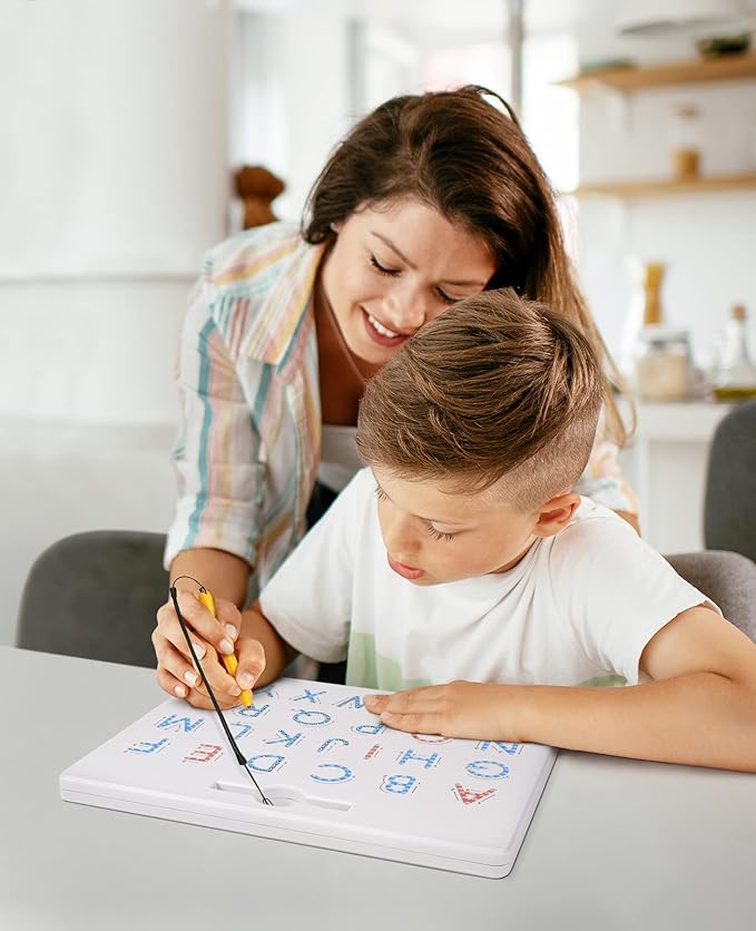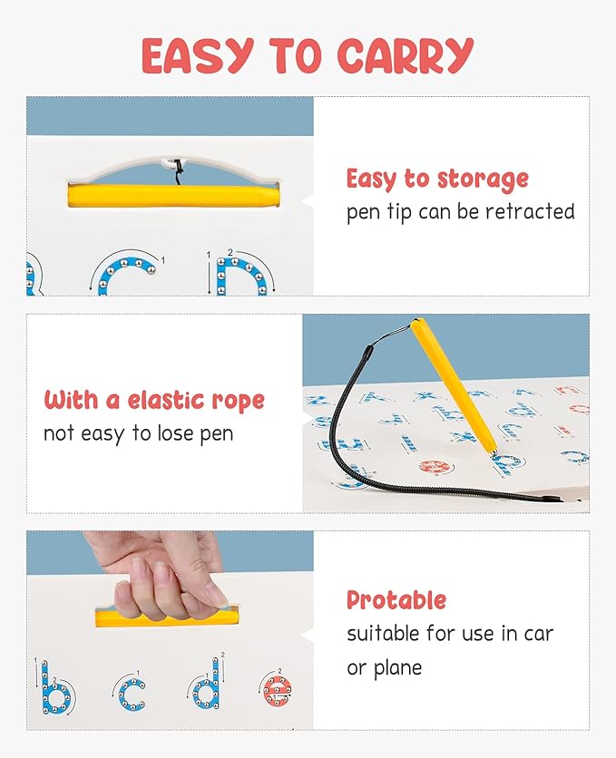 • Great Tool to Teach Writing: Children using the stylus pen help them stay on the stroke - and they love to hear and see the metal beads pop up as they go. Then they can use their finger to erase each letter. With the sequence stroke and path direction instruction guide next to each alphabet character