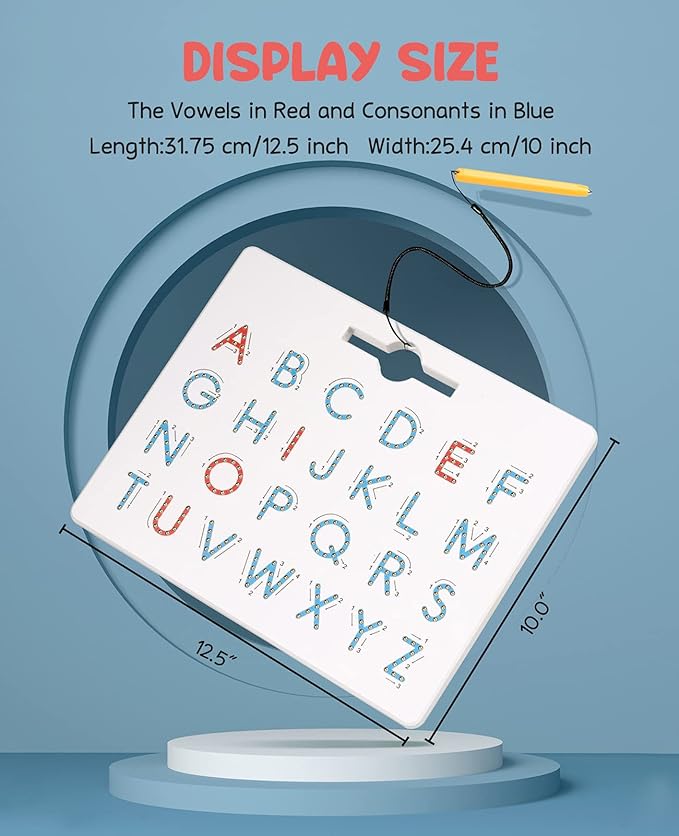 • 2 Sided Letter Tracing Board: Upper case on one side and Lower case on the other side. The vowels in red and consonants in blue are convenient for children to learn pronunciation and grammar