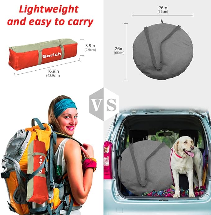 • Easy Set Up & Carry: Setting up fast within minutes. Gorich beach tent is much easier to fold than any kind of beach tents. It could fold down to a travel size of 17"H x 4"L x 4"W, weight 3.5 lbs, with a campact carrying bag that you even won’t notice it on your backpacks, much easy to carry