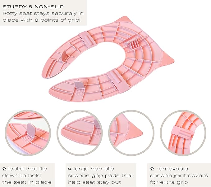 • ✔️ STURDY & NON-SLIP: The potty seat has 8 points of grip that help it stay securely in place. It includes 4 non-slip silicone grip pads under the ears and bottom ends and 2 locks that flip down to help the seat stay put and keep it from sliding. The 2 removable silicone joint covers also help to add more grip in the center of the seat, making it extra sturdy!