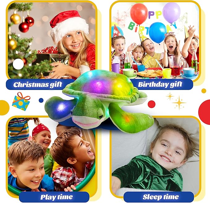 • Adorable Turtle Design โ€“ This adorable plush toy features a green turtle design. The colorful light-up tortoise makes a great playmate for both day and night. It's a great gift for children and loved ones for Christmas, Children's Day, Valentine's Day, birthdays, or any other special occasion.