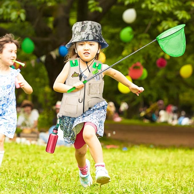 • Nature Explorer & Adventure Kit: Full kids explorer and adventure set includes: Vest, explorer hat, butterfly net, optical 5x binoculars, water bottle buckle, bug jar, magnifying glass, whistle, bug tongs, backpack