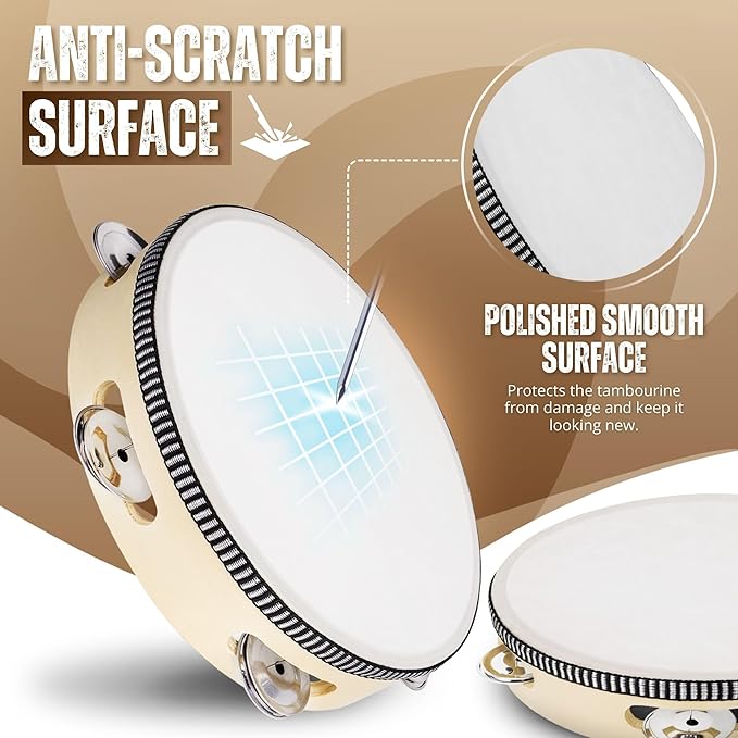 Flexzion Wood Handheld Tambourine 8" Inch Single Row 5 Pair Jingles (2 Pack, Wood) - Hand Held Percussion Drum Moon Musical Tambourine with Ergonomic Handle Grip
