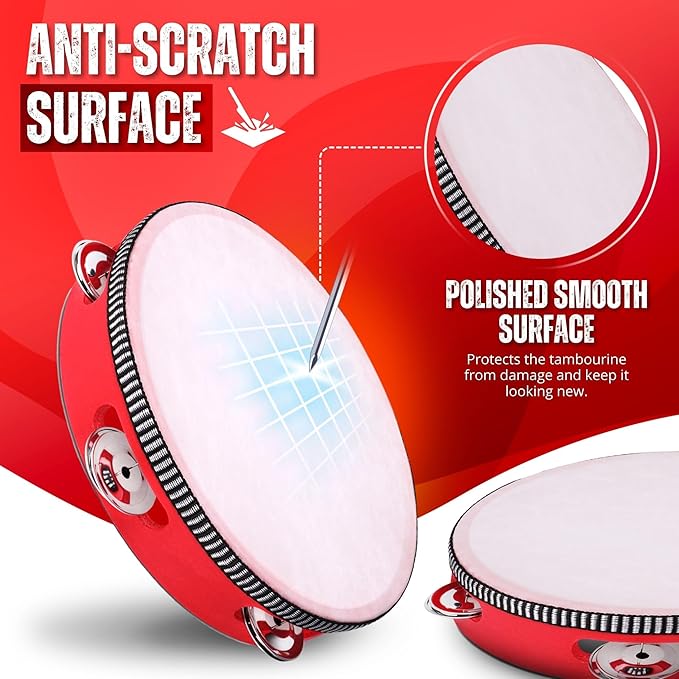 Flexzion Wood Handheld Tambourine 8" Inch Single Row 5 Pair Jingles (2 Pack, Red) - Hand Held Percussion Drum Moon Musical Tambourine with Ergonomic Handle Grip
