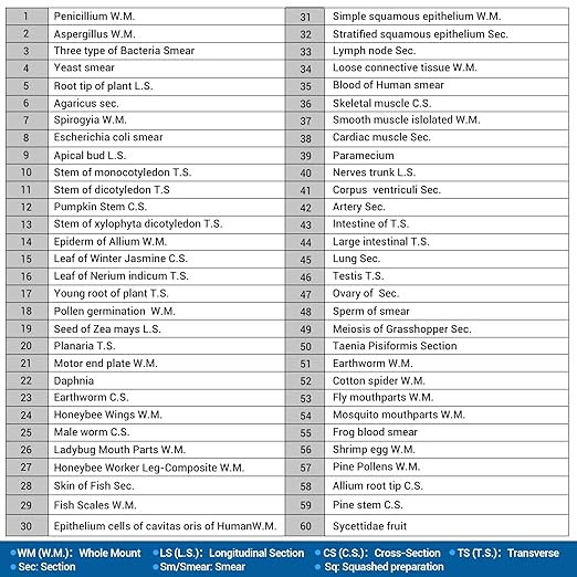 • Set of 60 prepared microscope slides, including plants, insects, and animal tissues, for use in biological education