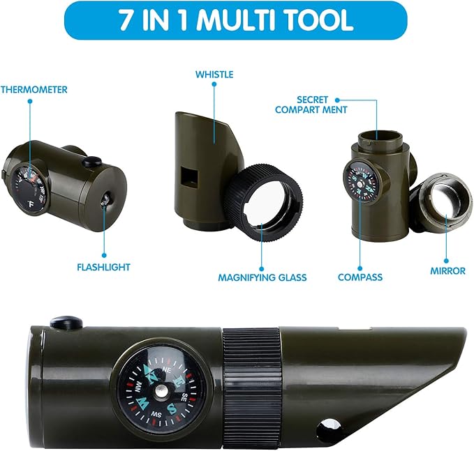 • COMPLETE EXPLORER KIT FOR KIDS - Full Bug Catcher Kit For Kids includes Safari Costume Kids x1, Safari Hat x1, Kids Binoculars x1, Kids Backyard Bugs Book x1, Telescopic Butterfly Net x1, Magnifying Glass x1, 7 IN 1 Multi Tool x1(which contains a flashlight, thermometer, compass, whistle, magnifying glass, mirror and secret compartment), Kids Bug Catching Kit with Magnifier x1, Tweezer x1, Bug Tong x1, Organization backpack x1. Wonderful outside toys for kids ages 4-8 outdoor toys for kids 8-12.