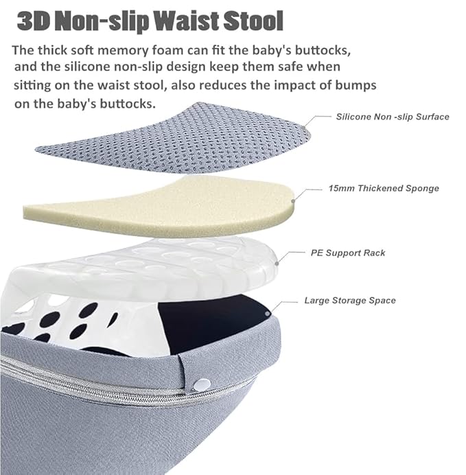 • Ergonomic Hip Seat: The waist stool maintains the baby's M-shape during carrying, helping their skeletal development. The wide waistband make the hip seat to fit snugly against the parent's waist, helping to share the weight during carrying baby. The inward sloping angle of the hip seat keeps the baby close to the parent's body comfortably and reduces bumps and shaking when parents walking. Besides, it make baby feel safety in their arms.
