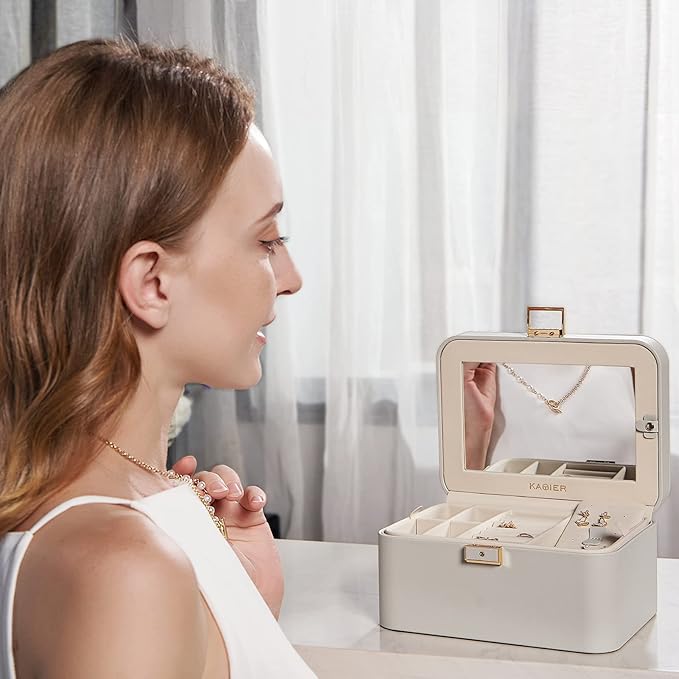 KAMIER Jewelry Box, 2 Layers PU Leather Jewelry Organizer Box, Large Capacity, Double Lock and Large Mirror, Hidden Necklace Hooks, Removable Dividers, Grey