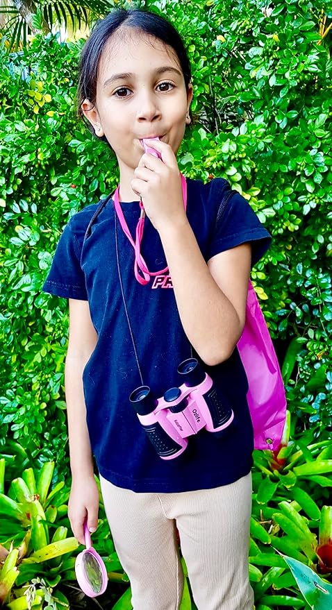 • 🔍LARGE MAGNIFYING GLASS - 3 x magnification for examining plants, insects and rocks. Wonderfully fun for camping trips and outdoor or indoor investigations. SAFE Non Choking pealess FOX WHISTLE - great for hiking, scouting, sports, games and safety locator. Clip on thick lanyard to be worn around the neck for quick access for signaling location or emergency use.
