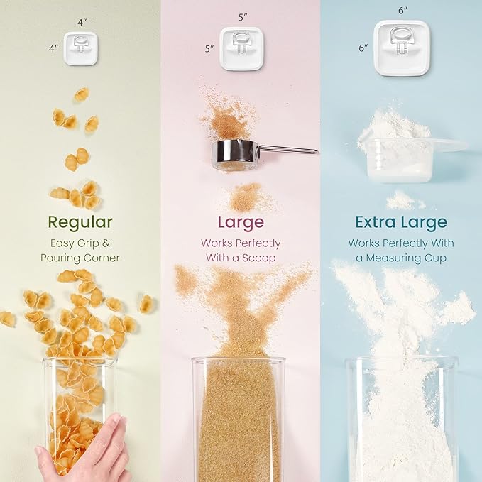 • AVAILABLE IN VARIOUS SIZES & SHAPES: The Felli Flip-Tite container comes in a variety of sizes and shapes to meet different food storage needs. The 4" REGULAR and RECTANGULAR sizes are perfect for organizing small kitchen counters and pantries, making handling and pouring easy. The 5" LARGE size is ideal for storing items like sugar and beans that need scooping. The 6" XL size is specifically designed for storing large quantities of food such as rice, powder, and flour, which require measuring spoons. We offer a versatile storage solution to suit all your needs.