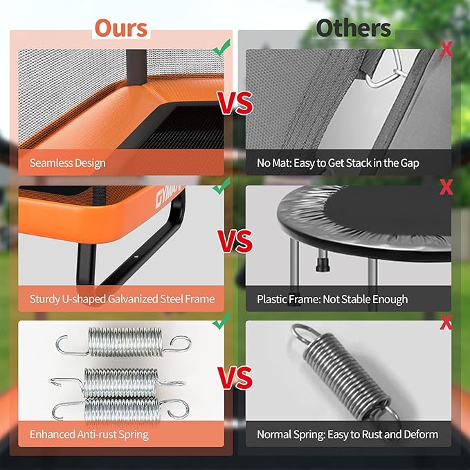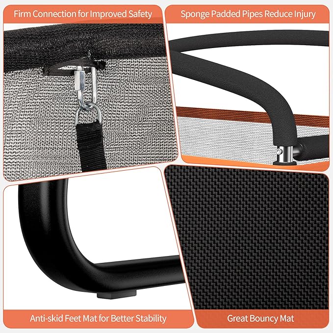 • High Elasticity: Featuring 40 galvanized springs and a high density jumping cloth, this premium trampoline offers an ultimate bouncing experience. Kids will enjoy jumping and release endless energy joyfully. Meanwhile, bouncing helps children bone growth.