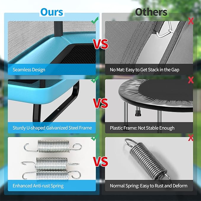 • High Elasticity: Featuring 40 galvanized springs and a high density jumping cloth, this premium trampoline offers an ultimate bouncing experience. Kids will enjoy jumping and release endless energy joyfully. Meanwhile, bouncing helps children bone growth.