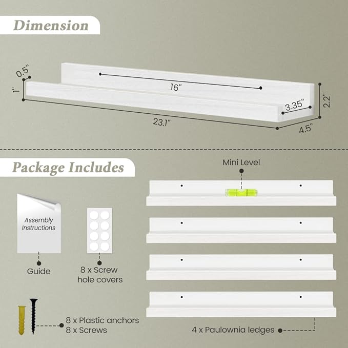 • 【Perfect solution for your walls】The floating shelves for wall & picture ledge shelf is SAME SIZE as each other (L 23.1" x D 4.5" x H 2.2") and is such an easy way to display photos without making lots of holes in your walls. The nursery book shelves are crafted from Paulownia wood which are lightweight yet proportionately strong, sustainable real wood. They come fully assembled and all mounting hardware is included in the package. Sturdy enough to hold up to 20 lbs with proper installation.