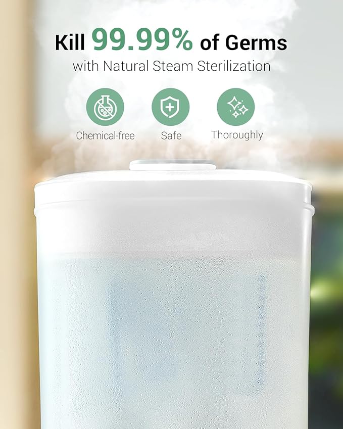 • 𝟳𝟮-𝙃𝙤𝙪𝙧 𝙂𝙚𝙧𝙢-𝙁𝙧𝙚𝙚 𝙎𝙩𝙤𝙧𝙖𝙜𝙚: Our innovative storage function maintains a germ-free environment for 3 full days (48 hours longer than standard 24-hour sterilizers), ensuring bottles stay sterile even through midnight feedings. Enjoy extended peace of mind and freedom with this industry-leading preservation.