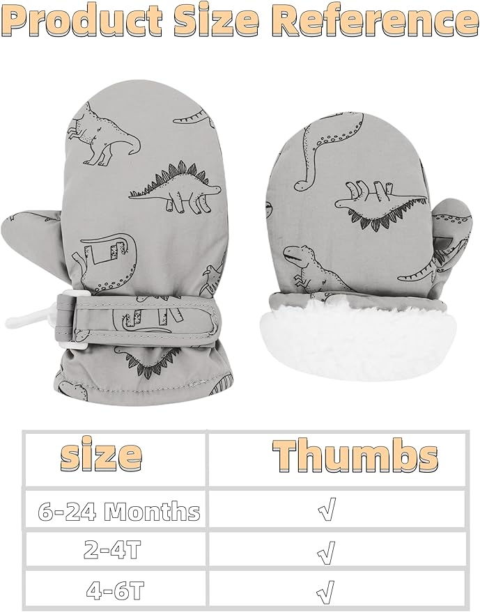 • This toddler fleece mittens have 3 sizes for your reference: Small size fit 6-24 month baby w/O thumbs, Middle size fits 2-4T toddler and Large size fit 4-6T Kids.