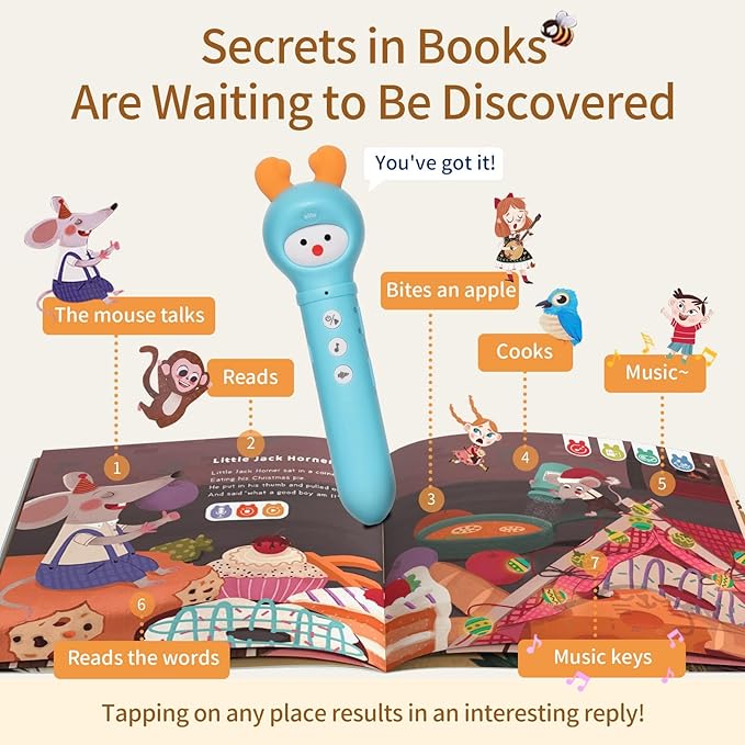 • 【Rich Pre-stored Content】The reading pen for kids has pre-stored with 48 nursery rhymes, 16 stories, and 14 sleeping music, allowing children to listen to music to relax when outside of study, and sooth the baby to sleep.