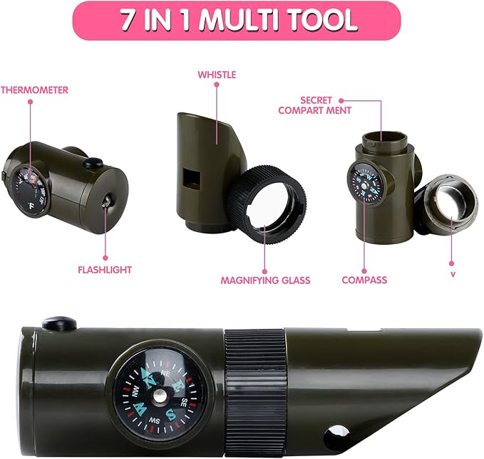 • Complete Kids Adventure Kit - Full Kids Exploration and Adventure Set includes Safari Cargo Vest x1, Safari Hat x1, Binocular x1, Kids Backyard Bugs Book x1, Telescopic Butterfly Net x1, Magnifying Glass x1, 7 IN 1 Multi Tool x1(which contains flashlight, thermometer, compass, whistle, magnifying glass, mirror and secret compartment), Bug Collector with Magnifier x1, Tweezer x1, Bug Tong x1, Organization backpack x1.