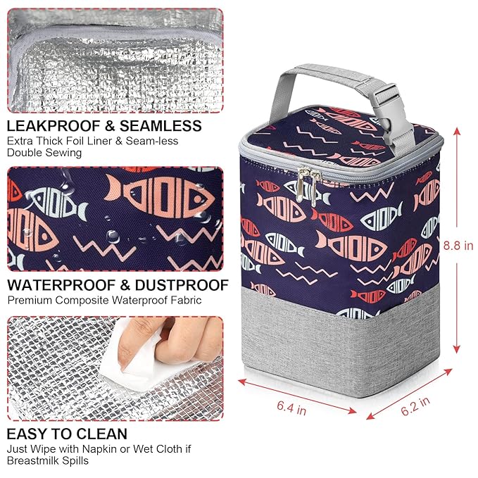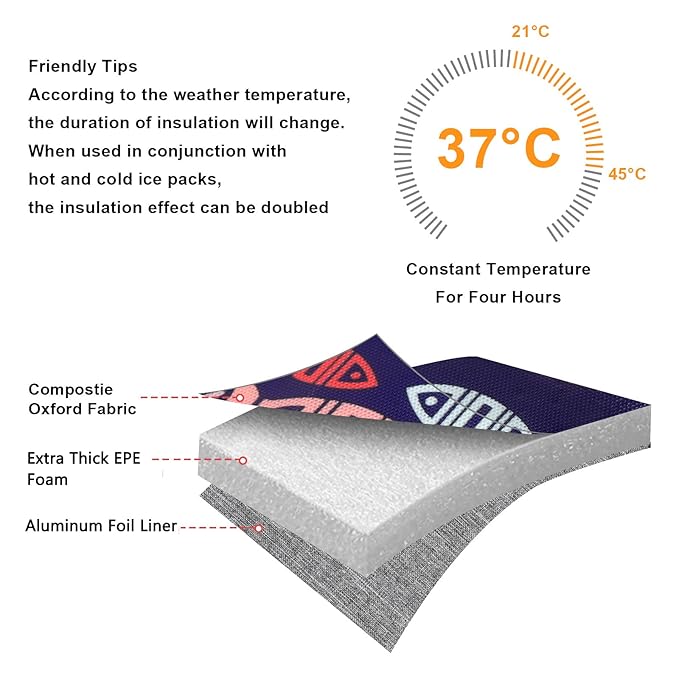 • HIGH QUALITY MATERIALS: Made of high quality water-resistant composite oxford fabric, 8mm extra-thick EPE foam and food-grade aluminum foil liner. No odor, non-toxic, food safe, durable, lightweight. Effectively keep bottles stay cold, warm or fresh for hours, it keeps breast milk fresh.