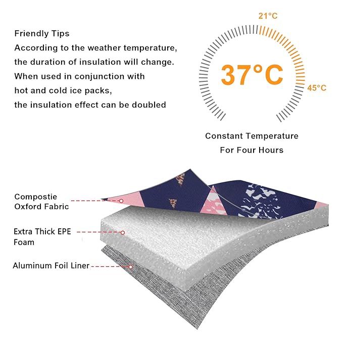 • HIGH QUALITY MATERIALS: Made of high quality water-resistant composite oxford fabric, 8mm extra-thick EPE foam and food-grade aluminum foil liner. No odor, non-toxic, food safe, durable, lightweight. Effectively keep bottles stay cold, warm or fresh for hours, it keeps breast milk fresh.