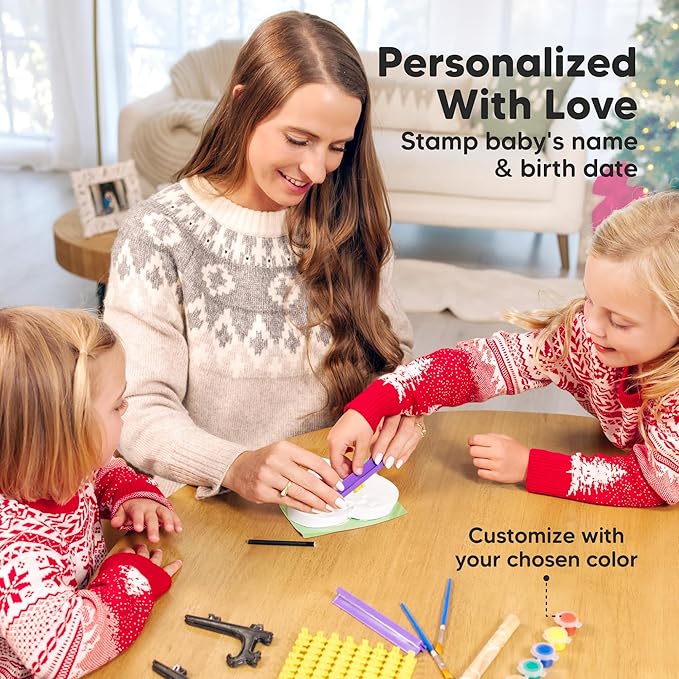 • Personalized Baby Print Ornament Maker - This baby clay handprint kit comes with bonus acrylic paint, paint brush, 6 satin ribbons, 2 twig strings and alphabet stamps. Create a special and memorable baby handprint kit and baby foot print kit.