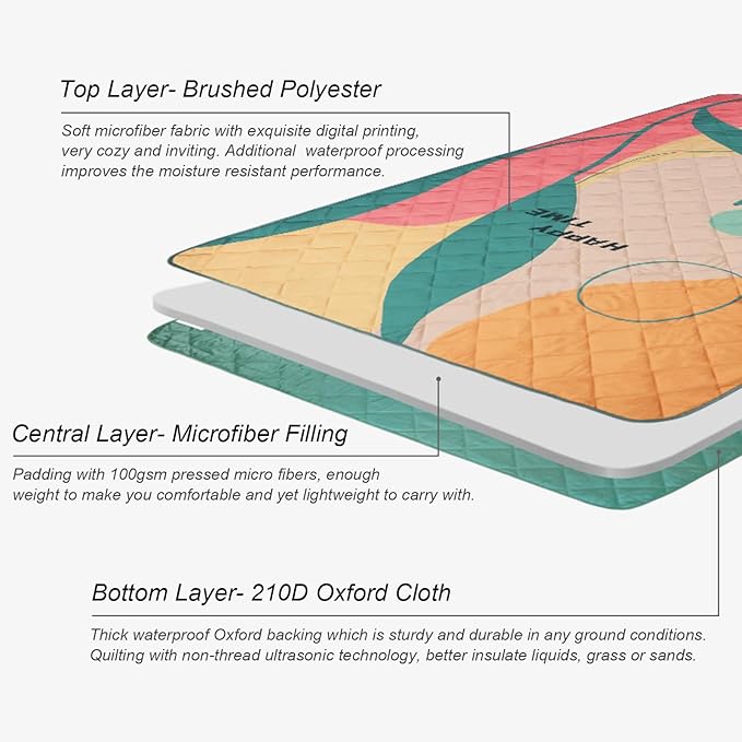 • Premium Three Layers Design: Crafted with soft brushed fabric on top, thick microfiber padding, and 210D Oxford backing. Both sides feature a waterproof coating, while ultrasonic quilting improves moisture resistance and insulation from grass or sand