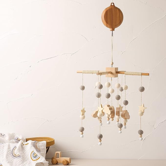 • 【Unique Texture 】: The unique texture makes the music box fit into many wooden baby mobile arm, bohemian, natural and beautiful, decorating a more beautiful bedroom for your child.Musical Box fits most crib mobile hanger,crib mobile arm.2 AA batteries are required, not included