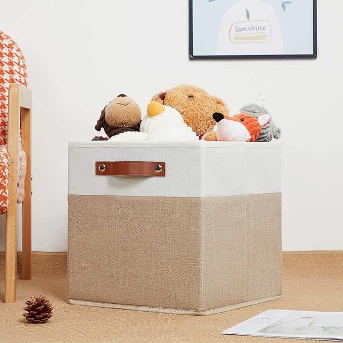 • 【Sturdy Leather Handles 】Sturdy thickened leather handles and metal iron buckles make cube storage basket easy to carry even with a heavy load. Cardboard is inserted at the bottom and sides to provide support, so that these decorative storage cubes 12 x 12 to stand on, holding the shape well and can be used for a long time