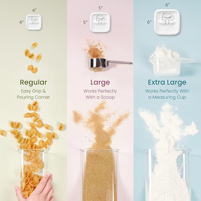 • AVAILABLE IN VARIOUS SIZES & SHAPES: The Felli Flip-Tite container comes in a variety of sizes and shapes to meet different food storage needs. The 4" REGULAR and RECTANGULAR sizes are perfect for organizing small kitchen counters and pantries, making handling and pouring easy. The 5" LARGE size is ideal for storing items like sugar and beans that need scooping. The 6" XL size is specifically designed for storing large quantities of food such as rice, powder, and flour, which require measuring spoons. We offer a versatile storage solution to suit all your needs.