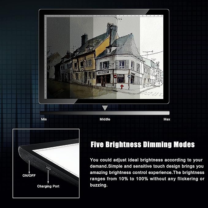 • 【5-LEVEL BRIGHTNESS & SIDE BUTTON】 With the 5-level light setting, you can adjust the table lighting according to ambient lighting and paper thickness/weight to suit your projects. The button is designed on the side, so you won't turn on/off the light pad accidently any more.