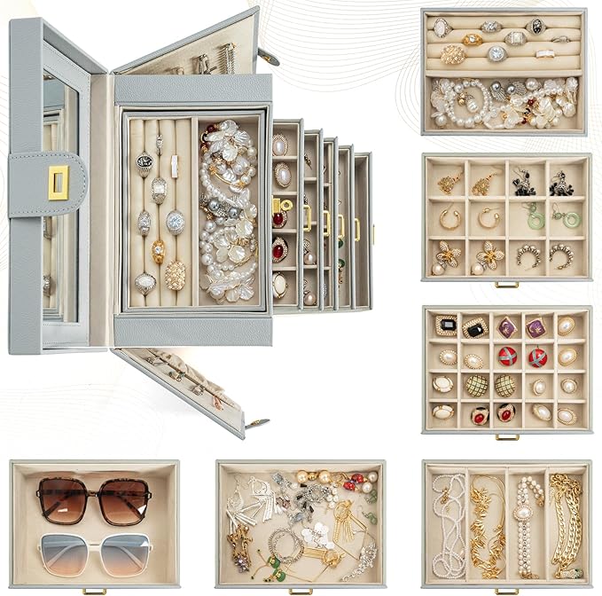 AKOZLIN Large Jewelry Box Organizer Functional Lockable with Big Mirror, Leather Jewelry Storage Case for Women Girls Ring Necklace Earring Bracelet Holder Organizer Grey