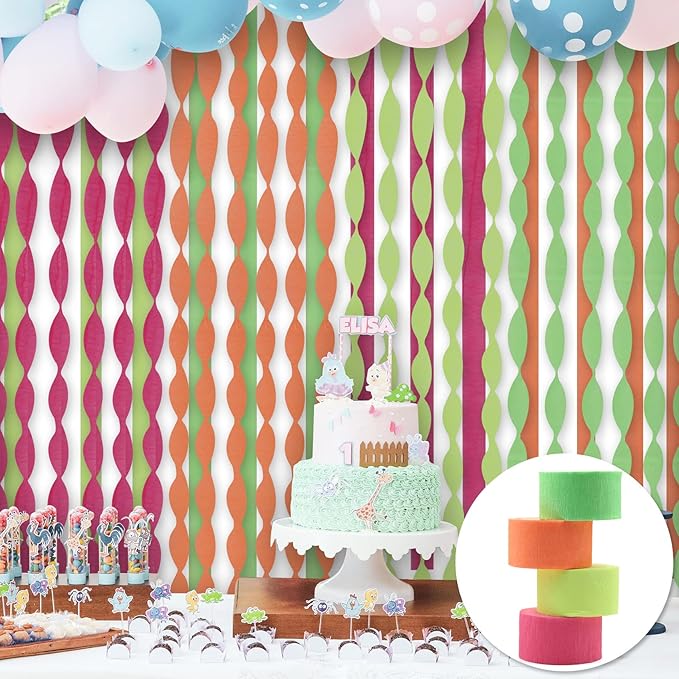 • Ideal Size and Bright Colors: Package contains 8 rolls of large sized crepe paper streamers in 4 colors of green, orange, yellow, pink. They are Neon Colors under normal light, but glow under black light. 800 feet/Each roll measures approx. 1.6 inches in width and 100 ft in length. Ideal Size for neon Party supplies