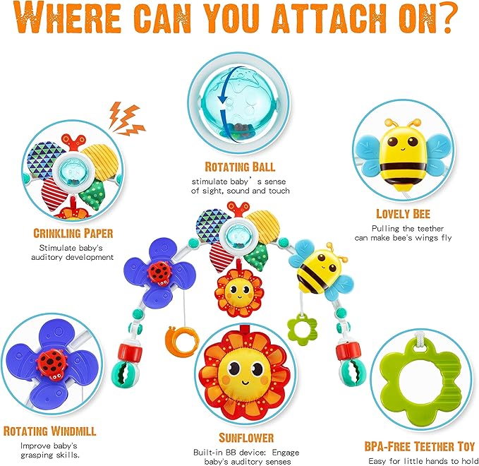• Entertained Car Seat Toy: Keep your baby engaged and entertained during car rides with this stroller arch toy that conveniently clips onto your little one's car seat handle.