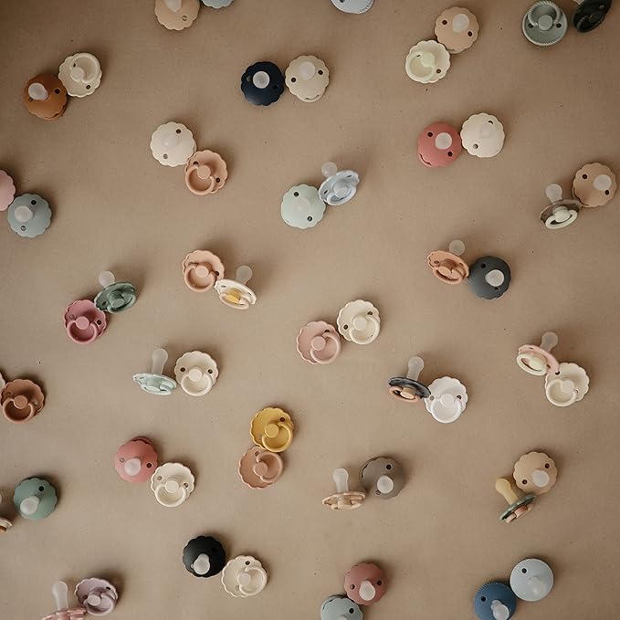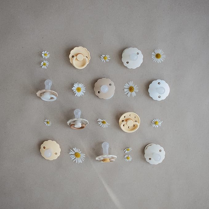 • The FRIGG line of daisy silicone pacifiers with improved SilkySoft nipple and an innovative Click-lock System has been thoughtfully designed for your baby's comfort. The outward curve keeps the pacifier off their delicate skin, while features like air holes and a security handle ensure your baby stays safe. Available in a range of soft colors, FRIGG pacifiers make a beautiful addition to your collection of baby essentials.