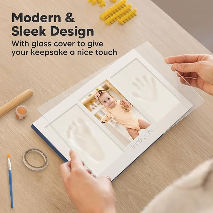 • Sturdy Wood Frame, Real Glass Cover - Our baby handprint footprint keepsake kit maintains its pristine condition for years to come. Itโ€™s a lovely, everlasting newborn keepsake for your baby room decor. A must-have newborn baby essentials.