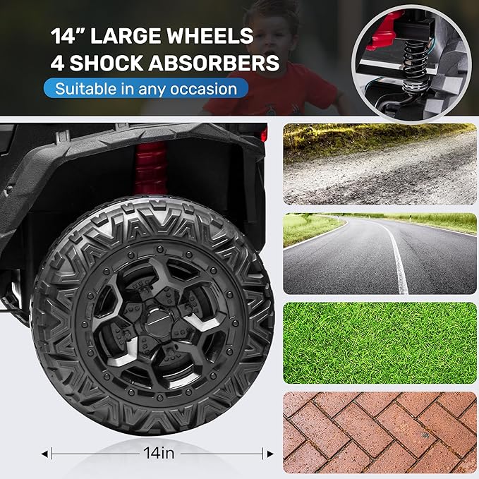 • SAFE DRIVING WITHOUT WORRY: The remote control can override the manual mode, just press the P button to activate emergency braking when there is any potential danger; 4 anti-skid wheels with spring suspensions ensure smooth driving; the key-start and the soft start design, the lockable doors on both sides, all ensure driving safety and protecting children in all aspects