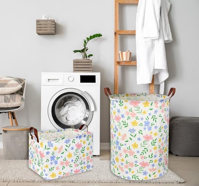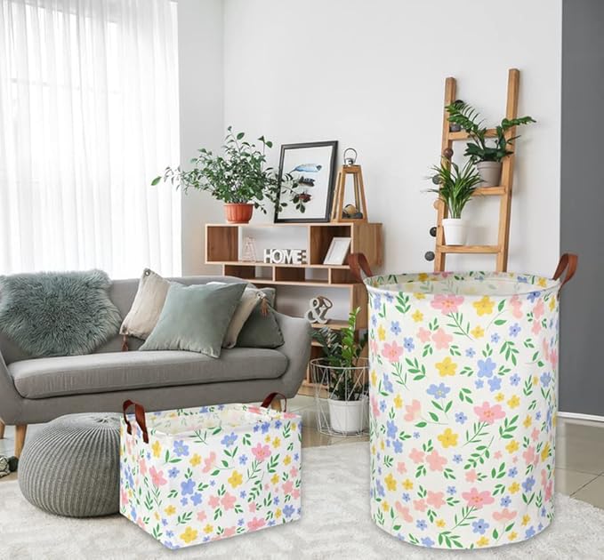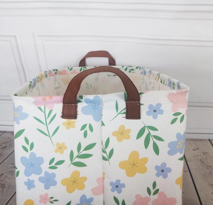 • ADVANTAGE OF DESIGN:1.Practical design: flower print baby girl basket stands when in use and can be folded for space saving and easy storage when you do not want to use it at the time.2.Reinforced handles: kids toy basket has handles on both sides, which is easy to carry.